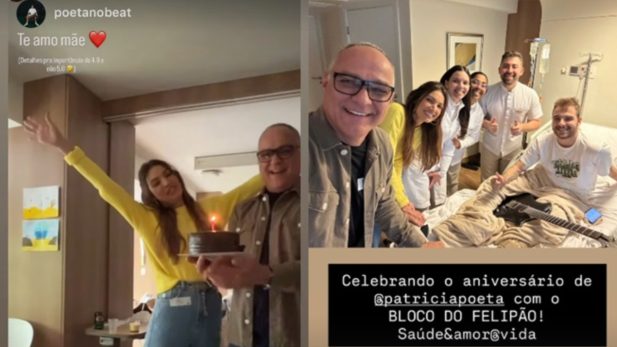 Felipe, filho de Patrícia com o diretor Amauri Soares, também vem recebendo o apoio dos pais no hospital. No domingo (19), a jornalista comemorou o aniversário ao lado dele, que registrou o momento nas redes sociais. No vídeo, o jovem aparece cantando “Parabéns pra Você” enquanto a mãe sorri emocionada ao receber um bolo levado pelo ex-marido. “Te amo, mãe! Detalhe para a importância do 4.9 e não 5.0”, escreveu ele na legenda.