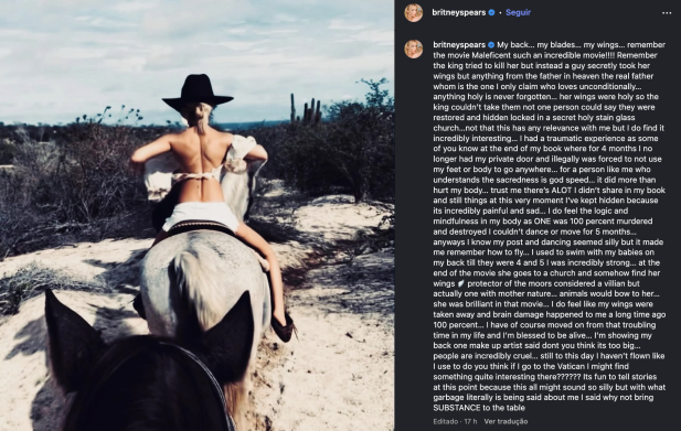 No texto, Spears começou relembrando o enredo do filme da Disney em que Malévola tem suas asas arrancadas. “Minhas costas… minhas lâminas… minhas asas… lembra do filme ‘Malévola’, um filme incrível! Lembra que o rei tentou matá-la, mas em vez disso um cara secretamente tirou suas asas, uma coisa vinda do pai no céu, o verdadeiro pai, que é o único que eu reivindico e que ama incondicionalmente, tudo que é sagrado nunca é esquecido”, escreveu ela.