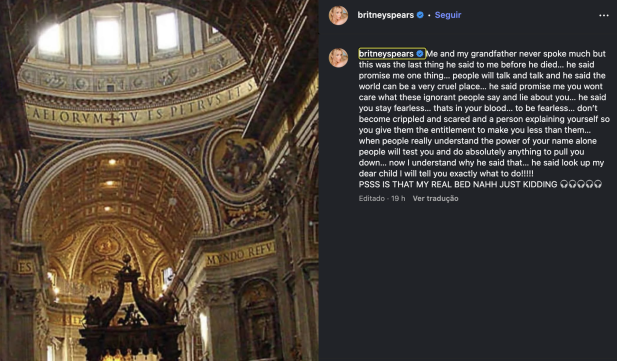 No mesmo dia das novas postagens, Britney também compartilhou um relato sobre uma conversa com seu avô antes de sua morte. “Ele me disse que o mundo pode ser um lugar muito cruel, mas me fez prometer que eu não ia me importar com o que essas pessoas ignorantes dizem e mentem sobre mim”, escreveu ela. “Ele disse para eu permanecer destemida. Isso está no seu sangue, ser destemida, não ficar paralisada e assustada. Quando as pessoas realmente entenderem o poder do seu nome, elas irão testá-lo e fazer absolutamente qualquer coisa para derrubá-lo”, completou.