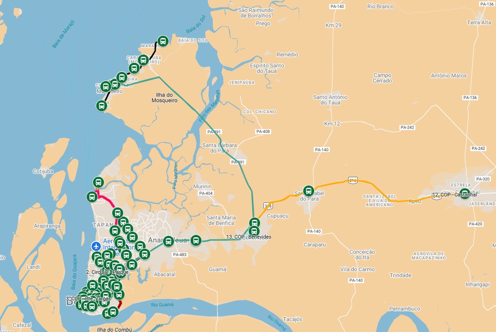 COP – Outeiro; Circular – Parque; COP – Pte. Vargas; COP – Aeroporto-Outeiro; COP – Condomínios; COP – Pedro Miranda; COP – Mário Covas; COP – Ver-O-Peso; COP – Icoaraci; COP – Jurunas; COP – Marambaia-UFPA; COP – Castanhal; COP – Benevides; COP – Mosqueiro; Mosqueiro Vila.