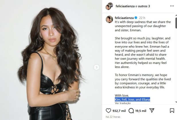 A influenciadora Emman Atienza morreu nesta quarta-feira (22), em casa, aos 19 anos. A família da jovem — Kim, Feli, Jose e Eliana — publicou um comunicado no Instagram nesta sexta-feira (24) informando sobre o falecimento. Na postagem, eles prestaram uma homenagem para Emman.