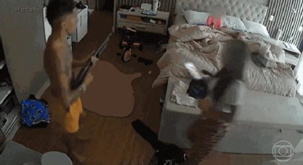 Na gravação, o influencer leva um susto ao ver os policiais e avisa a esposa, que se levanta rapidamente. Ela aponta para um celular, o alvo pega o aparelho e vai para outro cômodo. A mulher, que está grávida, vai atrás dele. Já a filha do casal, de apenas 4 anos, permanece deitada na cama.