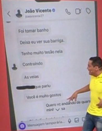Na semana passada, o jornalista Leo Dias divulgou supostos prints de mensagens íntimas atribuídas ao artista. Em um dos trechos, João teria escrito: “Foi tomar banho? Deixa eu ver sua barriga, tenho muito tesão nela, contraindo as veias. P*ta que pariu, você é muito gostosa. Quero você andando de quatro na minha casa”.