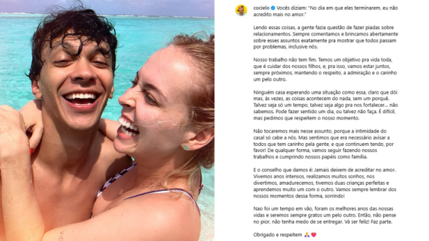 Cocielo informou aos seguidores o fim de seu casamento com Tata na quinta-feira (16), em um post no Instagram. Os dois trocaram as alianças em 2018. “Vocês diziam: ‘No dia em que eles terminarem, eu não acredito mais no amor’. Lendo essas coisas, a gente fazia questão de fazer piadas sobre relacionamentos. Sempre comentamos e brincamos abertamente sobre esses assuntos exatamente pra mostrar que todos passam por problemas, inclusive nós”, começou.