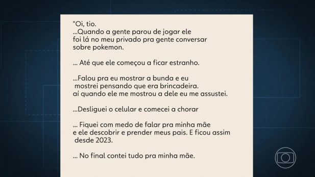 A menina também escreveu uma carta, de próprio punho, ao MP. “Quando a gente parou de jogar, ele foi lá no meu privado pra gente conversar sobre Pokémon… até que ele começou a ficar estranho. Falou pra eu mostrar a bunda e eu mostrei pensando que era brincadeira. Aí quando ele me mostrou a dele, eu me assustei. Desliguei o celular e comecei a chorar“, revelou.