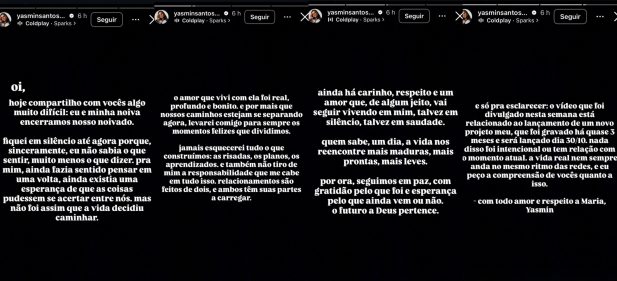 Yasmin ainda afirmou que o carinho pela ex-noiva permanece, mesmo com o término. “Ainda há carinho, respeito e um amor que, de algum jeito, vai seguir vivendo em mim, talvez em silêncio, talvez em saudade. Quem sabe, um dia, a vida nos reencontre mais maduras, mais prontas, mais leves. Por ora, seguimos em paz, com gratidão pelo que foi e esperança pelo que ainda vem ou não. O futuro a Deus pertence”, finalizou.